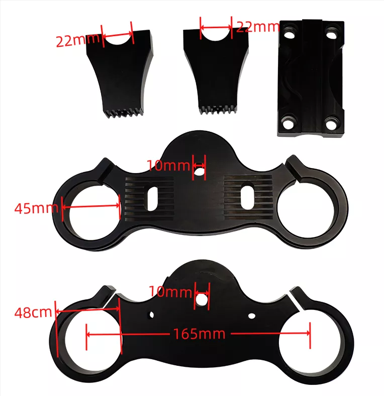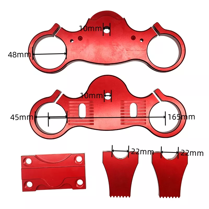 ایپلی کیشنز: یہ ہیوی ڈیوٹی CNC ٹرپل کلیمپ خاص طور پر پٹ بائک، گندگی والی بائک، اور آف روڈ گاڑیوں کے لیے تیار کیا گیا ہے، جو ناہموار خطوں پر بہتر استحکام اور کنٹرول کی پیشکش کرتا ہے۔ اس کے ہلکے وزن کے ڈیزائن اور مضبوط تعمیر کا امتزاج اسے موٹرسائیکل کے پرزوں میں اعلیٰ کارکردگی اور انحصار کے خواہاں سواروں کے لیے ایک بہترین آپشن بناتا ہے۔