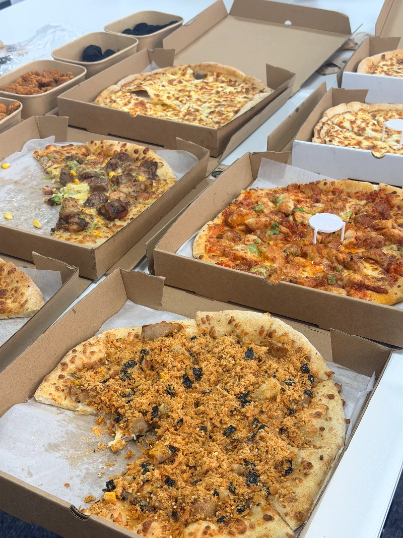 کالی مرچ گائے کے گوشت کے بڑے ٹکڑے، میٹھی مکئی اور تازہ سبزیوں کے ساتھ جوڑا۔ پگھلا ہوا پنیر کے ساتھ ملا ہوا لذیذ گوشت - اطمینان بخش اور توانائی بخش۔ اورلینز چکن پیزا بالکل اتنا ہی اچھا تھا - نرم، ذائقہ دار، اور یہاں تک کہ نان ویجی سے محبت کرنے والے بھی سیکنڈوں کے لیے چلے گئے۔ یہ ایک مصروف دوپہر کے لیے بہترین ایندھن تھا۔